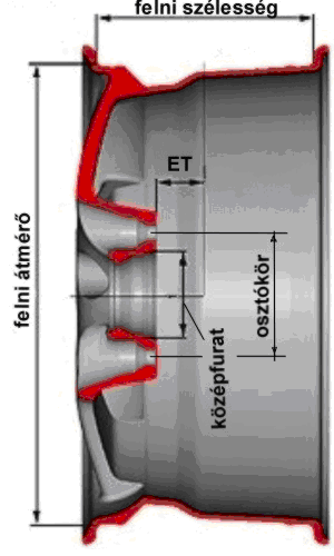 • ET 49 - besajtolás mélysége mm-ben. Ez a felni középvonala és a féktárcsára illeszkedő kerékagy közti távolság